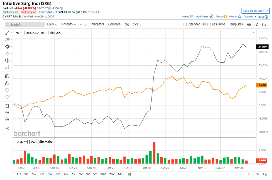 Despite its notable strength, ISRG slipped 6.8% from its 52-week high of $616, achieved on Jan. 23. Over the past three months, ISRG stock gained 21.1%, outperforming the Nasdaq Composite’s ($NASX) 7.8% gains during the same time frame.