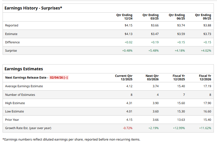 The defense giant is expected to announce its fiscal fourth-quarter earnings for 2025 soon. Ahead of the event, analysts expect GD to report a profit of $4.12 per share on a diluted basis, down marginally from $4.15 per share in the year-ago quarter. The company beat the consensus estimates in each of the last four quarters.