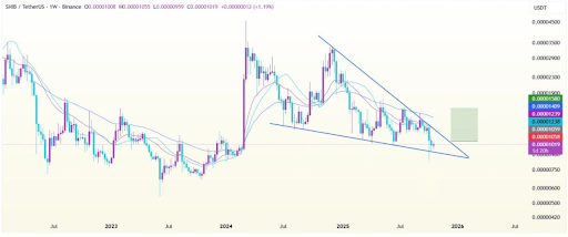 Even with the noise, the weekly chart for the Shiba Inu coin is forming a falling wedge, which many traders view as a potential bullish reversal. Price still needs a clean breakout and follow-through to confirm strength.